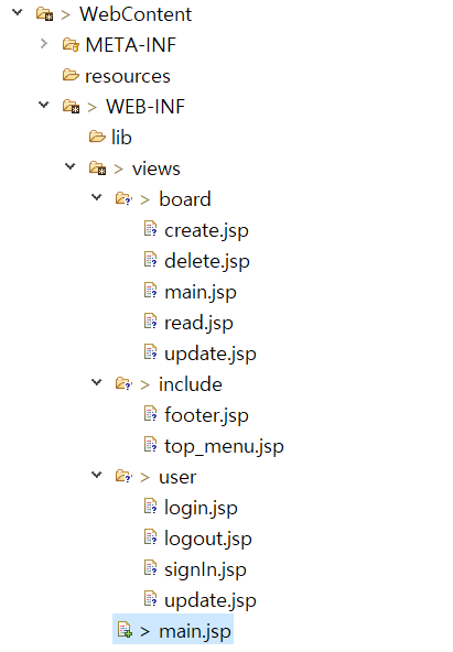게시판 관리를 위한 board 하위 폴더, 회원 관리를 위한 user 하위 폴더와, top_menu와 footer를 위한 include 폴더로 나눴고, 가장 상위 경로에 main.jsp가 있다.