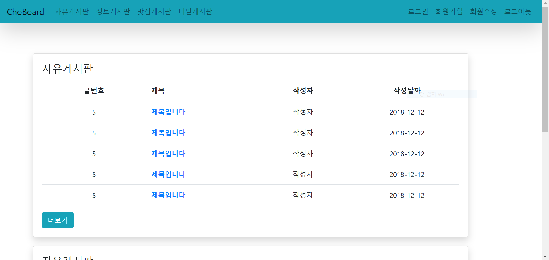 왼쪽 상단에 ChoBoard라는 웹사이트 이름과 그 옆에는 네 개의 게시판, 회원 관리를 위한 링크들이 있다.