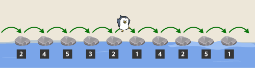 - 징검다리는 일렬로 놓여 있고 각 징검다리의 디딤돌에는 모두 숫자가 적혀 있으며 디딤돌의 숫자는 한 번 밟을 때마다 1씩 줄어듭니다.