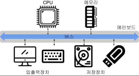 컴퓨터는 중앙처리장치(CPU), 메인메모리, 입력장치, 출력장치, 저장장치로 구성된다.