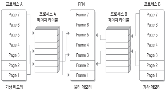 페이징 기법은 물리 주소 공간을 같은 크기로 나눠서 사용한다. 이때 물리 메모리의 각 영역은 가상 주소의 페이지와 구분하기 위해 프레임이라고 부른다.