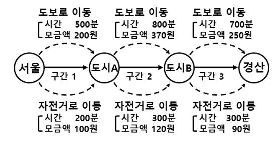 1, 2번 구간은 도보로, 3번 구간은 자전거로 이동해 모금액을 660으로 하는 것이 가장 좋은 방법입니다. 이때, 1,600시간이 소요됩니다.