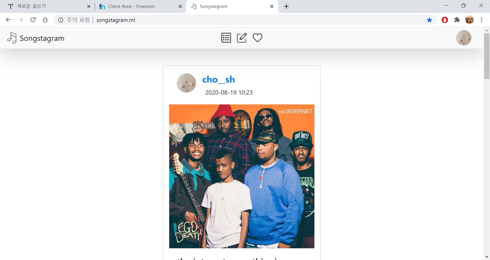 이걸 끝으로 등록이 모두 끝났고, 내가 바라는 대로 www.songstagram.ml 이라는 짧고 간단한 주소를 통해 내 프로젝트에 접근할 수 있게 됐다. 결과물을 보니 뿌듯하다.