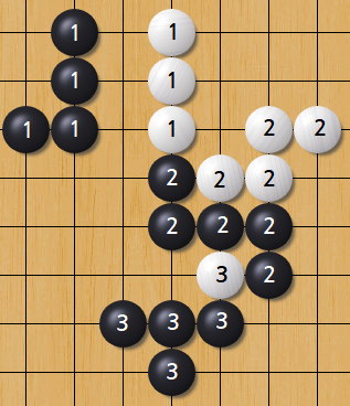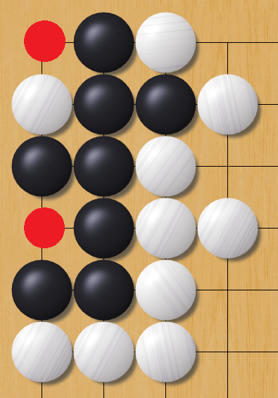 두 빨간 칸 모두 백의 입장에서 착수할 경우 연결된 그룹이 흑돌로 둘러싸이게 되어 원래 바둑의 규칙에서는 백의 입장에서 스스로 잡히는 곳이지만 Baduk2에서는 이와 무관하게 백이 빨간 칸 두 곳에 착수해 8개의 흑돌이 들어있는 그룹의 돌을 죽일 수 있다.